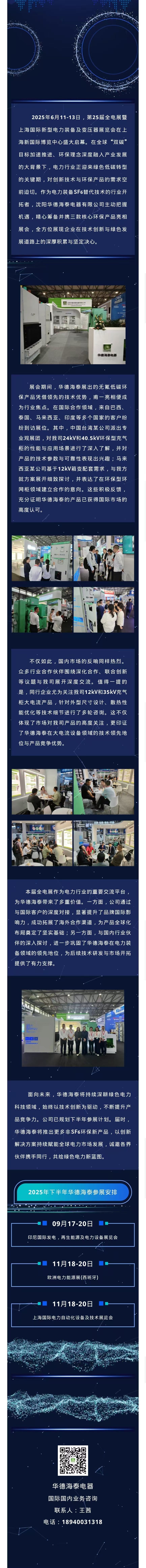 【概要描述】2025年6月11-13日,第25屆全電展暨上海國(guó)際新型電力裝備及變壓器展覽會(huì)在上海新國(guó)際博覽中心盛大啟幕。在全球“雙碳”目標(biāo)加速推進(jìn)、環(huán)保理念深度融入產(chǎn)業(yè)發(fā)展的大背景下,電力行業(yè)正迎來綠色低碳轉(zhuǎn)型的關(guān)鍵期,對(duì)創(chuàng)新技術(shù)與環(huán)保產(chǎn)品的需求空前迫切。作為電力裝備SF6替代技術(shù)的行業(yè)開拓者,沈陽華德海泰電器有限公司主動(dòng)把握機(jī)遇,精心籌備并攜三款核心環(huán)保產(chǎn)品亮相展會(huì),全方位展現(xiàn)企業(yè)在技術(shù)創(chuàng)新與綠色發(fā)展道路上的深厚積累與堅(jiān)定決心。